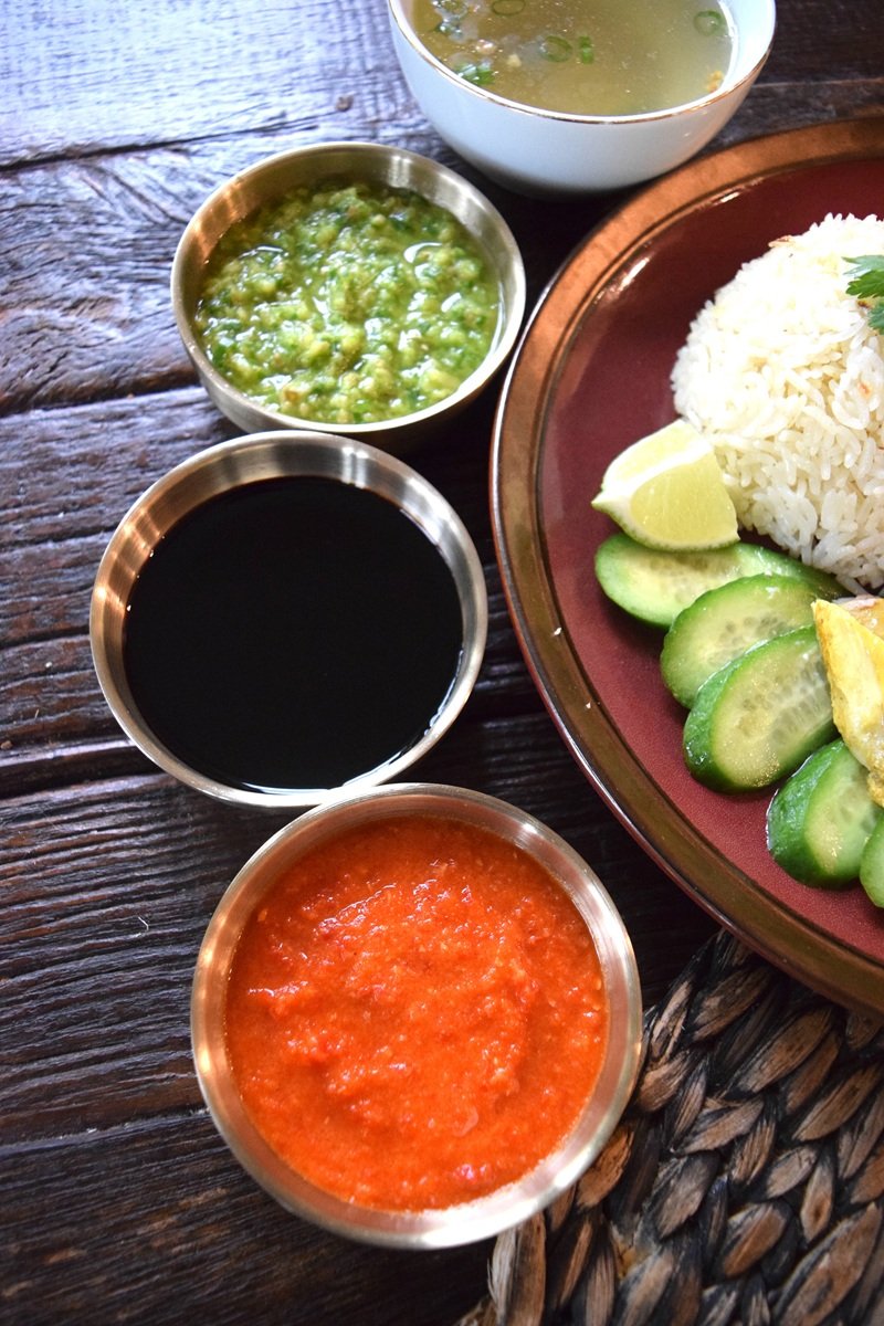 Classic Trio Condiments: Chili Sauce, Ginger Paste, Soy Seasoning