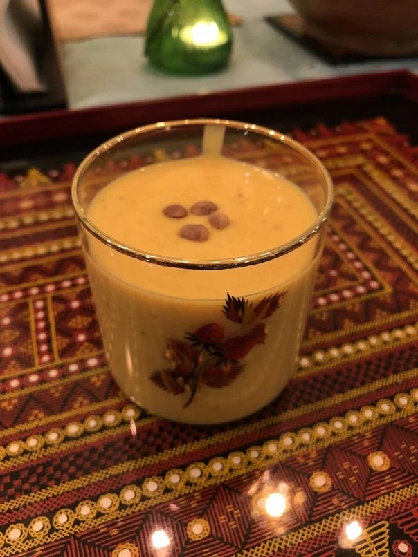 We start with Dabeli, an iconic street food hailing from the vibrant Kutch region of Gujarat. They are bite-sized toasted buns, lovingly stuffed with spiced potato and onion, and adorned with a lavish array of homemade chutneys. Delight in the symphony of flavors, including the sweet and tangy Imali, Gud, and Khajoor Ki (Tamarind, Jaggery, and Date) Chutney, the invigorating Dhaniya and Fudina (Cilantro and Mint) Chutney, and the fiery Lasun (Garlic) Chutney. Next up is Pani Puri, a crisp, hollow shell brimming with spiced mashed potato and tamarind chutney, bathed in a pool of tangy mint-infused water, known as pani. Savor the delightful explosion of flavors and crunch with each bite of this beloved street food favorite. As the perfect pairing to all the spicy treats, we make a Vegan Mango Lassi (drink) using a combination of fresh mango pulp, oat milk, and almond yogurt with a hint of lemon and cardamon for a refreshing, fragrant, and creamy drink.
